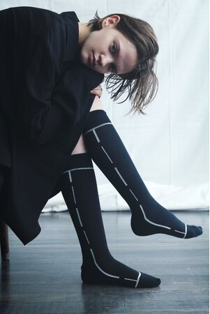 Y’s、CHICSTOCKSとのコラボレーションソックス第3弾を展開。CHICSTOCKSの定番の「ライン」が印象的なモデルをベースに、Y’sの視点でアレンジしたライン着圧ソックスや、ラメ糸を使用した薄手のハイゲージソックスに加え、「Y」と「S」が後ろに配された起毛ソックスをラインナップ。