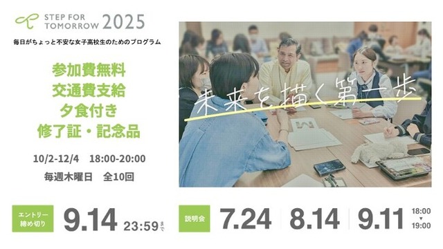 経済状況や不登校、その他の家庭の事情で将来に不安を感じている女子高校生が、自分の未来を見つけ、第一歩を踏み出すための全10回のプログラムです。