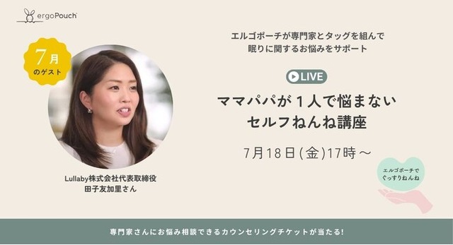 weskiii(ウェスキー)株式会社(本社:東京都港区 https://weskiii.com/)が運営するオーストラリア生まれのスリーピングウェアブランド「ergoPouch(エルゴポーチ)」は、赤ちゃんとファミリーの質の高い睡眠をサポートする「エルゴポーチでぐっすりねんね」企画の一環として、夜泣き改善アプリLullaby(ララバイ)株式会社代表取締役の田子友加里さんとのInstagram LIVEを7月18日(金)に開催します。