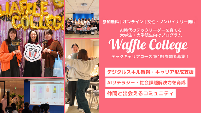 テクノロジー分野のジェンダーギャップ解消を目指す特定非営利活動法人Waffle(東京都港区、理事長:田中 沙弥果、以下Waffle)は、本年8月に開講するテクノロジー分野でのキャリアを目指す女子大学生・大学院生向けプログラム「Waffle College(ワッフル・カレッジ)(*1)」の第4期テックキャリアコースの提供を開始します(*2)。