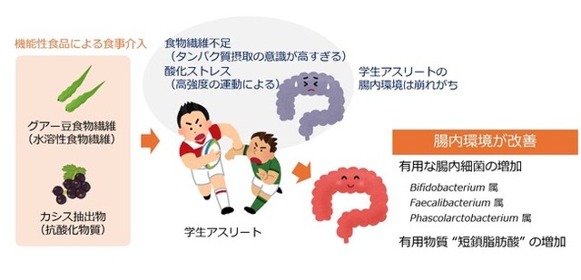森下仁丹株式会社(本社:大阪市、代表取締役社長 森下雄司、以下「森下仁丹」)は、摂南大学(学長:久保康之)農学部応用生物科学科 動物機能科学研究室 井上亮教授、三浦広卓招聘研究員、農学部食品栄養学科 藤林真美教授、織田奈央子助教、スポーツ振興センター 瀬川智広准教授の研究チーム、京都府立医科大学大学院医学研究科 消化器内科学 高木智久准教授、生体免疫栄養学講座 内藤裕二教授、栄養・病理学研究所、太陽化学株式会社(本社:三重県四日市市、以下、太陽化学)との共同研究で、摂南大学ラグビー部員を対象に食事介入試験を行い、機能性食品(グアー豆食物繊維およびカシス抽出物)の摂取によって腸内環境が改善することを明らかにしました。
