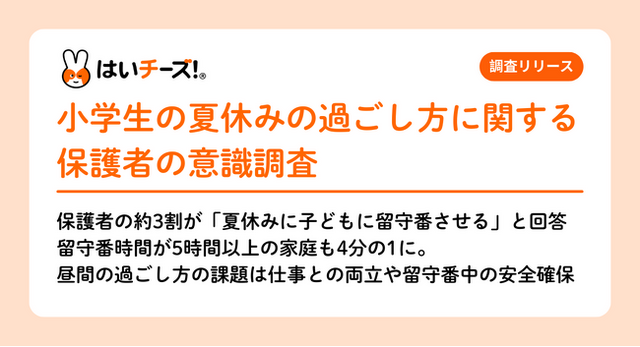 写真と食の力で子どもの幸せを創ることを目指す総合保育テックサービス「はいチーズ!」を提供する千株式会社(本社:東京都千代田区、代表取締役社長 千葉伸明、以下 当社)は、小学生の子どもをもつ保護者を対象に、夏休み期間中の過ごし方や家庭内の工夫・課題に関するアンケートを実施しました。