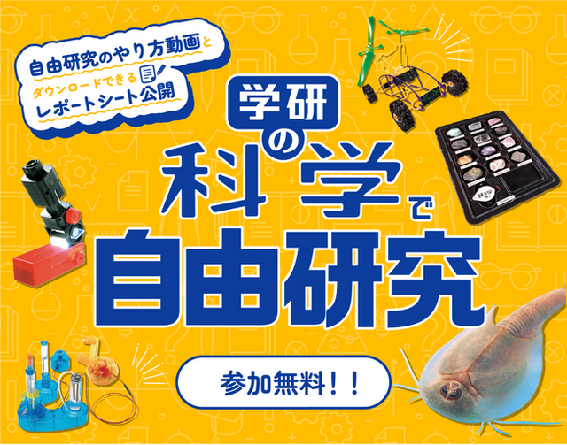 昨夏大好評だった自由研究お助けコンテンツ「学研の科学で自由研究」を、今年も実験キットつき書籍『学研の科学』のオンラインコミュニティ「あそぶんだ研究所」にて公開いたします。夏休み限定で、無料でどなたでもアクセスできるスペシャルコンテンツです。