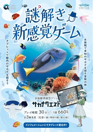 「サカナクエスト」はタブレットを使って水族館内のサカナを探しだし、サカナに関するクイズや謎解きに挑戦する、新感覚の水族館探検型ゲームです。