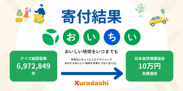 品川区、代表取締役社長CEO:河村晃平、以下「クラダシ」)は、6月の環境月間にあわせて「おいしい地球をいつまでも。」をテーマに、「おいちいプロジェクト2025」を5月30日から6月30日まで実施しました。期間中に実施したクイズキャンペーンでは、クイズ1回答につき1円を環境保全に取り組む「日本自然保護協会」へ寄付する形式で、総回答数6,972,849件を達成し、上限としていた10万円を同協会へ全額寄付しました。