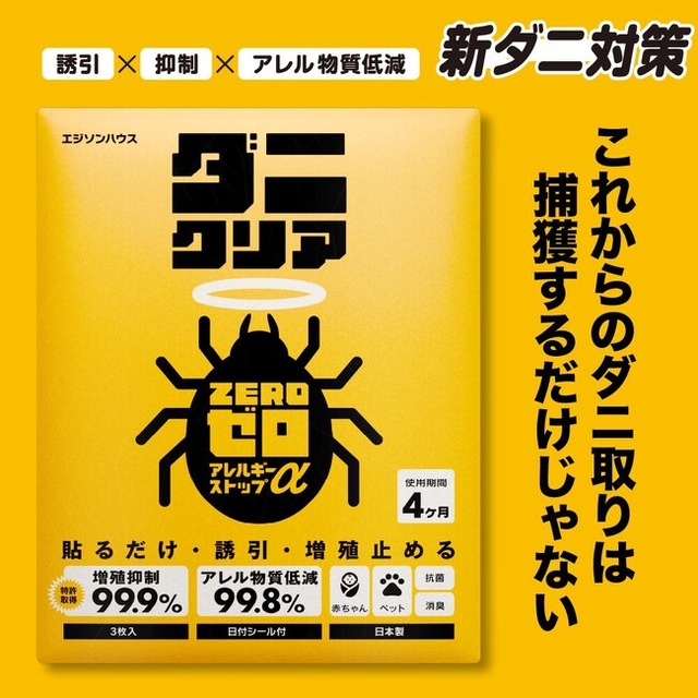 ダニ対策の新定番「ダニクリアゼロ アレルギーストップα」は、置くだけでダニを集めて繁殖を抑えるシートタイプの対策製品です。酵母由来の食品品質成分を使用した誘引剤でダニを引き寄せ、シート内の有用成分が成長や繁殖を妨げることで、ダニ数の99.9%を抑制します。さらに、アレル物質を99.8%低減※1。