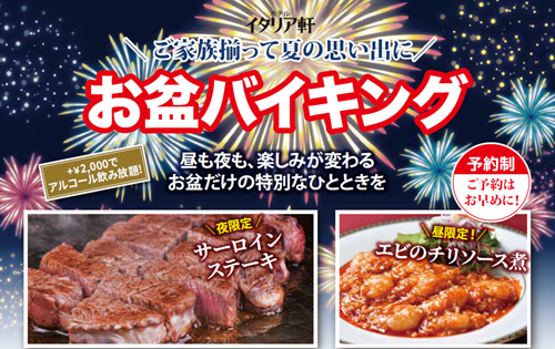 NSGグループのホテルイタリア軒では、ご家族皆様の夏の思い出作りにぴったりな『お盆バイキング』を8月13日(水)に昼の部・夜の部で開催いたします。
