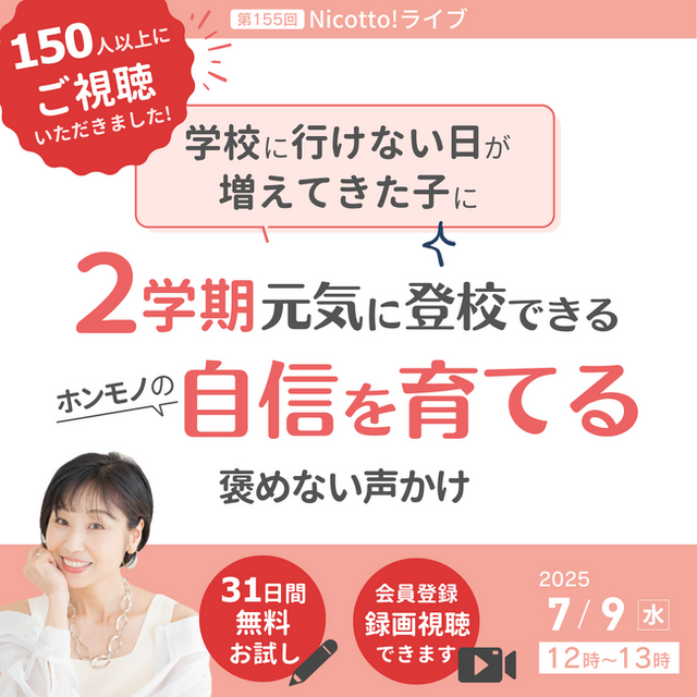 150人以上がリアルタイムで視聴した今回のライブは現在、Nicotto!塾の会員限定で見逃し配信中です。長期休暇を迎える今こそ、登校しぶり・不登校で傷つく親子が減るよう、声かけや関わり方を整えるきっかけにしていただけたらと願っています。
