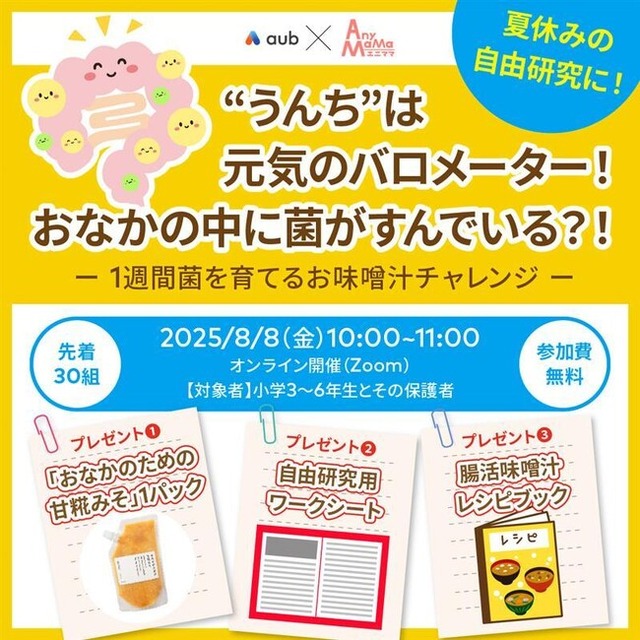 最初の取り組みとして、この夏、エニママはAuBとともに、“家族で取り組む腸活”をテーマに、夏休み期間を活用した2本の無料オンラインセミナーを開催いたします。