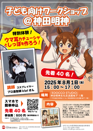 NPO法人秋葉原観光推進協会(ATPA:理事長 泉登美雄)は、2025年8月1日(金)に開催される「AKIBAサブカルサミット@神田明神2025」の一環として、**千代田区の小学生とその保護者を対象とした夏休み親子ワークショップ「ウマ耳カチューシャ&しっぽ制作体験」**を実施いたします。