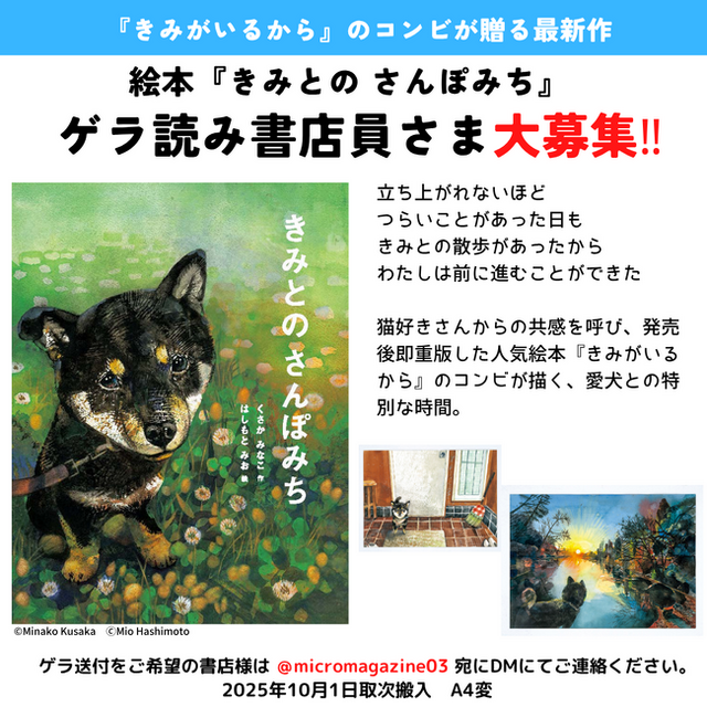マイクロマガジン社(東京都中央区)は、2025年10月刊行予定の新作絵本『きみとの さんぽみち』のゲラ(校了前の原稿)を読んでくださる書店員さまを募集いたします。
