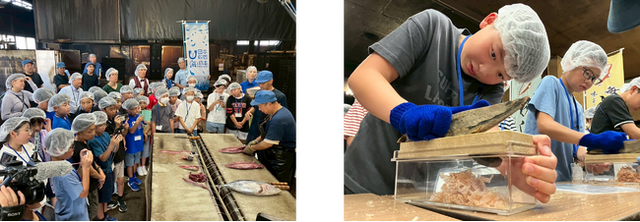 焼津市コースには28人が参加。鰹節工場の見学では、昭和25年創業の老舗「トマル水産」に伺いました。大石智之社長と従業員、焼津鰹節水産加工業協同組合のスタッフの協力を得て、カツオを3枚におろす作業などの製造工程を見学。その中で、カツオをいぶすための薪(コナラ)は山梨県や長野県産のものが使用されていいて「薪のしまりが良く、けむりのにおいが味を良くする」などの説明を受けました。参加者は鰹節削り体験と試食を行い「海の食べ物が山梨と関係があって驚いた」、「一度食べたら止まらないくらい美味しい」、「初めて削りたて食べたけど美味しい」、「家の鰹節よりも香りがよくて、味が濃い」など笑顔で話していました。[画像2: https://prcdn.freetls.fastly.net/release_image/161057/122/161057-122-85c22a7354e4393d4cb9b5640bc5aeb9-1954x677.png?width=536&quality=85%2C75&format=jpeg&auto=webp&fit=bounds&bg-color=fff ]