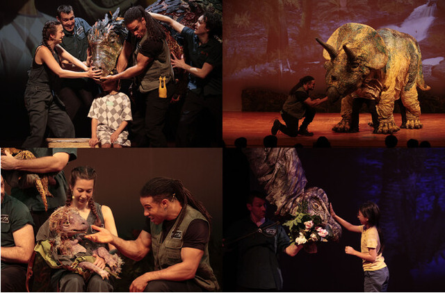 舞台上で恐竜に花をあげる様子