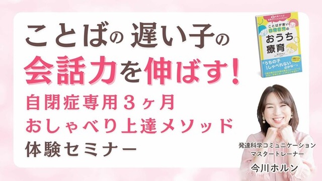株式会社パステルコミュニケーション(本社:東京都豊島区、代表取締役吉野加容子)代表の吉野加容子が開発した、親子のコミュニケーションをスムーズにして子どもの発達を加速させる「発達科学コミュニケーション」講師・今川ホルンが、ことばの遅い子の会話力をどんどん伸ばす「自閉症専用3ヶ月おしゃべり上達メソッド体験セミナー」を7/24,28の2日間開催いたします。人気WEBサイトコラム連載記念特典として、参加申込者先着10名様、『ことばが遅い自閉症児のおうち療育』書籍プレゼントお申し込み詳細はこちら<https://www.agentmail.jp/form/ht/65049/2/>