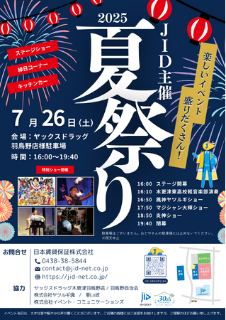 日本賃貸保証株式会社(本社:木更津市、代表取締役:梅田真理子、以下「JID」)は、2025年5月に本社を木更津西口に移転いたしましたが、これまで本社を構えておりました木更津市羽鳥野にて、地域の皆さまへの感謝の気持ちを込めて夏祭りを開催する運びとなりました。