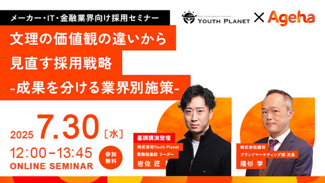 コーポレートブランディング支援を行う株式会社揚羽(東京都中央区 代表取締役社長:湊 剛宏 証券コード:9330)は、2025年7月30日(水)に「文理の価値観の違いから見直す新卒採用戦略 -成果を分ける業界別施策-」と題したメーカー・IT・金融業界向け採用セミナーを、オンラインで開催します。セミナー詳細はコチラ。