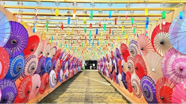 「風鈴まつり」の約6,000個の風鈴と、「和傘物語」の約400本の和傘の共演