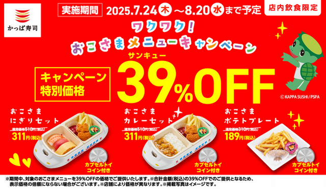 かっぱ寿司ではおこさま連れのお客様から大人の方まで、かっぱ寿司に来たらワクワクする!お得なキャンペーンを開催しております。おこさま連れの皆様、お待たせしました!たくさんの熱いリクエストにお応えし7月24日(木)より8月20日(水)の期間、全店で対象のおこさまメニュー“39(サンキュー)%”OFFを実施いたします!