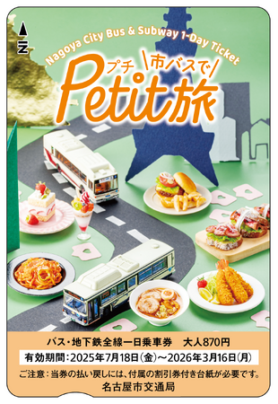 専用デザインの「バス・地下鉄全線一日乗車券」と人気のなごやめしなどのグルメを楽しめる「お食事チケット」をセットにしたお得な企画乗車券を販売します。