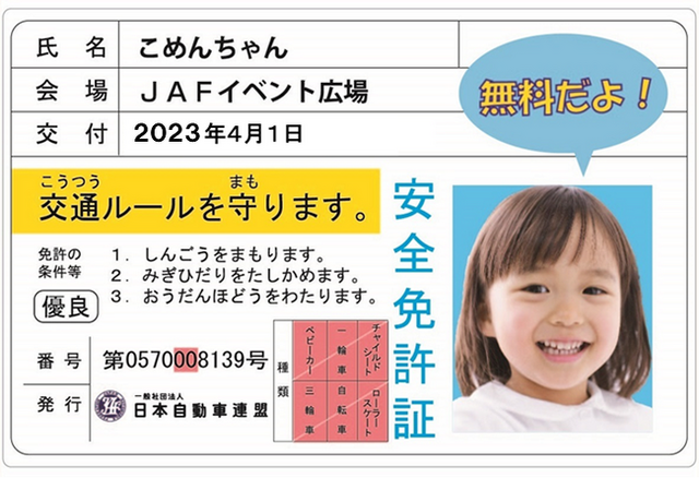 JAFブースでは、会員問わず来場された方を対象に、交通安全のクイズに答えるともらえる、免許証そっくりのカード「子ども安全免許証」を無料発行します。家族一緒に楽しみながら、交通ルールを学ぶことができます。