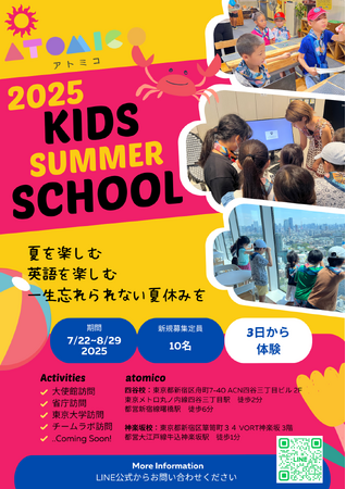 スパトレ株式会社(本社:東京都千代田区、代表取締役:向井麻里絵)は学童保育型英語スクール「atomico」にてサマースクールを開催いたします。レギュラー授業に加え、大使館訪問、英語観光ガイド体験、グローバル企業ツアーなど様々な特別プログラムをご用意しております。