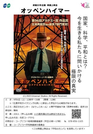 まず、さまざまな年代の方々が「平和」について考え、その思いを馳せるきっかけとして、1年を通じて映画上映会を開催いたします。上映作品は、地域の組合員からなる「平和企画の会」のメンバーが、「ぜひ見てほしい」と思う映画をリストアップしました。第1回目となる映画上映会が7月26日(土)にレバンテホール(神戸市立垂水区文化センター)で行いますので是非、ご来場ください。