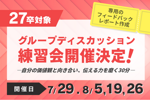 グループディスカッションの練習をしたい27卒の皆様からのご参加をお待ちしています。
