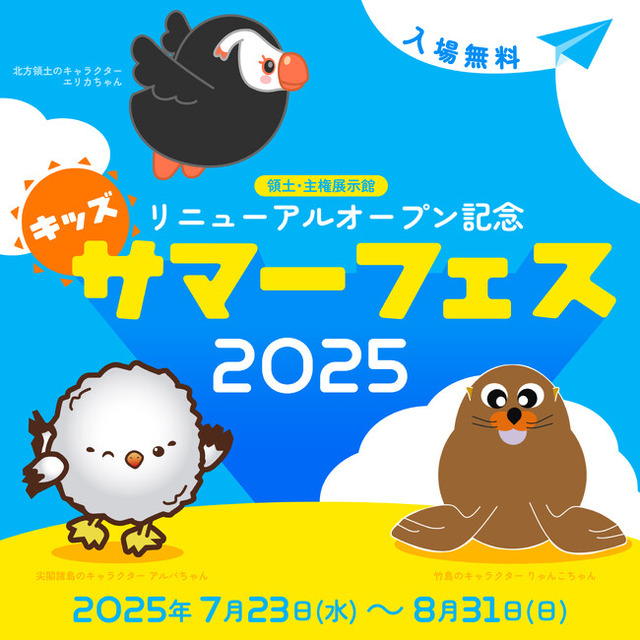 領土・主権展示館では、「領土・主権展示館リニューアルオープン記念 キッズサマーフェス 2025」を2025年7月23日(水)から開催します。このイベントは、子どもが楽しめる!をテーマに、幼児~高校生を対象にしたプログラムを用意しています。