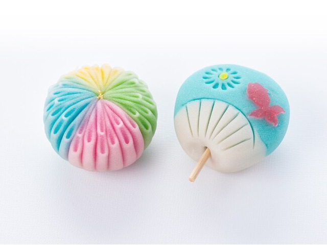 大阪初登場となる「花火」は、夏の夜空に咲く大輪の花火とうちわをモチーフに、練り切りで仕立てた上生菓子です。繊細な細工と鮮やかな色づかいで、目にも涼やかな一品に仕上げました。
