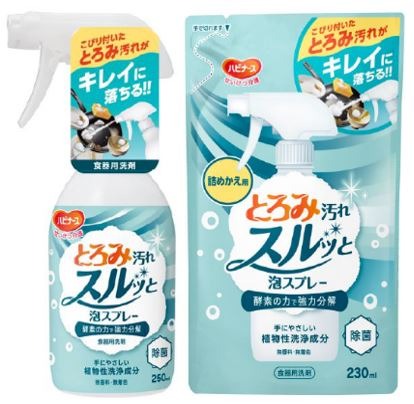 この度発売する「とろみ汚れスルッと泡スプレー」は、食器に強くこびり付いたとろみ汚れを強力分解する酵素を配合した、泡スプレータイプの食器用洗剤です。酵素の力でとろみ汚れを分解し、短時間でキレイに洗浄。泡スプレータイプなので、スポンジが届きにくい溝やすき間にも泡を直接吹きかけることができ、細部までしっかり洗い上げることができます。