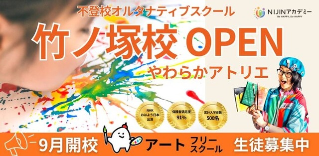 株式会社NIJIN(本社:東京都江東区、代表取締役:星野達郎)が運営する不登校オルタナティブスクール『NIJINアカデミー』はこの度、リアル教室として『NIJINアカデミー』における東京初のアートフリースクール“竹ノ塚校 やわらかアトリエ”を開校することをお知らせいたします。