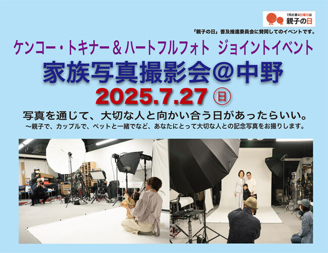 家族の笑顔を撮影します!株式会社ケンコー・トキナー(本社:東京都中野区、代表取締役社長:櫻井 匡)は、家族の絆をテーマに結婚、子ども誕生、親子の写真の撮影を行っている「Heartful Photo」による「家族写真撮影会」を開催。開催日時は2025年7月27日(日)。ケンコー・トキナー特設スタジオ(東京都中野区中野5-68-10)にて実施いたします。参加費は5,000円、先着15組までを募集します。写真を通じて、大切な人と向かい合う日があったらいい。~親子で、カップルで、ペットと一緒でなど、あなたにとって大切な人との記念写真をお撮りしますご来場いただいた皆様が被写体となり撮影スタッフが皆様の姿を写真に収めます。撮影所要時間は一組10分程度。お申し込み後に撮影時間を調整いたします。詳細および予約ホームページhttps://www.kenko-tokina.co.jp/service-shop/event/25727kazoku.html撮影料:5,000円(A4プリント2枚とデータ、発送代を含む)★スマートフォンによる家族の自撮り機材のデモンストレーションも同時開催します。撮影スタッフHeatful Photo熊谷 正長野県生まれ、東京綜合写真専門学校卒業、フリーのカメラアシスタントを経てスタジオベアーズ設立広告、雑誌でイメージフォト、商品撮影、人物写真を中心に撮影とWEB制作するかたわら、民俗芸能、舞台芸能のルポタージュフォトと、ふるさと回帰の写真撮影をライフワークにしている(公社)日本写真家協会『JPS』会友、インドネシア美術研究会会長、(公社)日本写真協会『PSJ』会員、日本旅行写真家協会正会員高橋まゆみ神奈川県横浜市出身、日本女子大学生活芸術学科中退、キヤノン販売(株)カメラサービス部勤務、サンフラワーフォトスタジオ他ポートレート写真スタジオ勤務、ブライダルスナップ会社数社勤務、2002年1月~フリーとなる個人ブライダル撮影、アルバム制作、人物撮影をするかたわら、心象風景写真、家族写真をテーマに撮影中(公社)日本写真協会『PSJ』会員イベント概要イベント名 7/27(日)、プロの写真家が家族写真を撮影する「家族写真撮影会@中野」開催日 2025年7月27日(日)時間 12:00~18:00会場 ケンコー・トキナー特設スタジオJR中央線・東京メトロ東西線「中野駅」徒歩7分〒164-8616 東京都中野区中野5-69-10地図 https://goo.gl/maps/PE9ri参加費 5,000円内容 ご来場いただいた皆様が被写体となり撮影スタッフが皆様の姿を写真に収めます。 撮影所要時間は一組10分程度。お申し込み後に撮影時間を調整いたします。参加方法 申し込みフォームにてお申し込みください。詳細および予約ホームページhttps://www.kenko-tokina.co.jp/service-shop/event/25727kazoku.html機材及びスタジオ協力:株式会社ケンコー・トキナーhttps://www.kenko-tokina.co.jp/