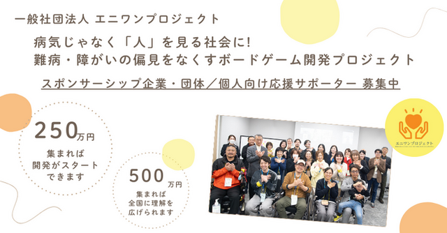 難病当事者3名が、「病気のある人もない人も当たり前に生きられる世の中に」をスローガンに掲げ活動する、非営利型一般社団法人エニワンプロジェクト(本社:東京都練馬区、代表理事:狐崎友希)は、2025年7月24日(木)より、難病や障がいと共に生きる世界を当事者視点で体験できるボードゲームを活用した、新たな共感啓発型プロジェクト『オタガイゴト体験共感プログラム』の実現に向けた支援募集を開始しました。
