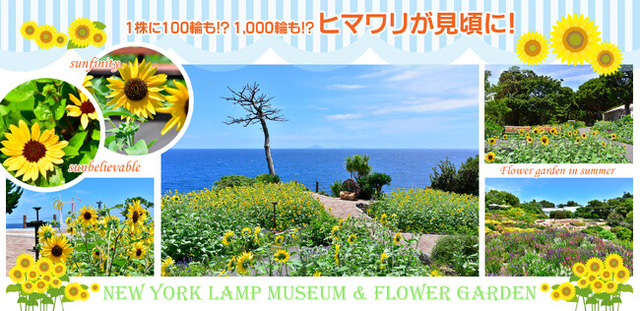 ニューヨークランプミュージアム&フラワーガーデンでは、ヒマワリの人気品種「サンフィニティ」と「サンビリーバブル」が見頃を迎え、目の前に広がる青い海と黄色い花々との鮮やかなコントラストがお客様の目を楽しませています。