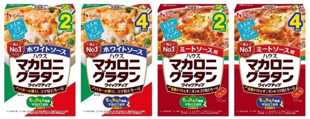 「マカロニグラタンクイックアップ」シリーズは、ソースに加えてハウス独自のもっちもち食感が特徴のマカロニも入っており、家庭にある身近な食材を使ってマカロニグラタンが手軽においしく作れる、粉末グラタンソース市場売上No.1(※1)ブランドです。バターが香るコク旨とろ~りなホワイトソースを楽しめる「マカロニグラタンクイックアップ ホワイトソース」と、完熟トマトとオニオンのコク・旨みが特徴のミートソースが味わえる「マカロニグラタンクイックアップ ミートソース用」、それぞれ2皿分と4皿分があり、計4種のラインアップとなっております。