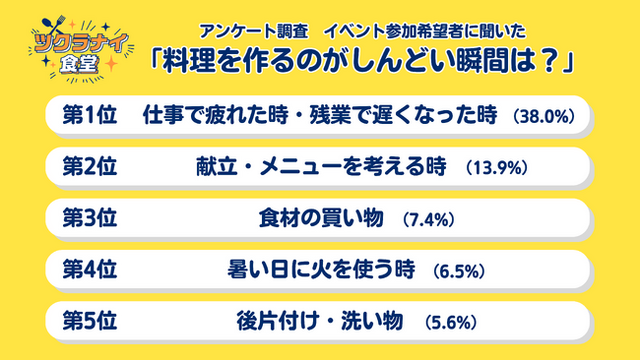 今回のイベント参加希望者へ事前アンケートを実施。料理を作るのがしんどいと感じる瞬間はどんな時ですか?と聞いた結果がこちら。[画像2: https://prcdn.freetls.fastly.net/release_image/55900/608/55900-608-15aa24bbd1f1fd3e140a0df9e1b6b141-3900x2194.png?width=536&quality=85%2C75&format=jpeg&auto=webp&fit=bounds&bg-color=fff ]