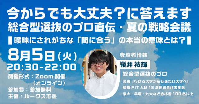 タイトル:今からでも間に合いますか? 総合型選抜のプロ直伝・夏の戦略会議日時:2025年8月5日(火)20:30~22:00
