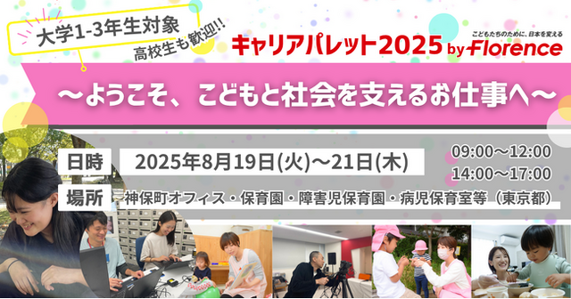 認定NPO法人フローレンス(東京都千代田区、代表理事:赤坂緑)は、こどもに関わる全ての仕事に関心のある高校1年生から大学3年生の学生を対象に、イベント「キャリアパレット2025~ようこそ、こどもと社会を支える仕事へ~」を、2025年8月19日(火)~8月21日(木)の3日間、東京都内の各施設(神保町オフィス・保育園など)で開催します。