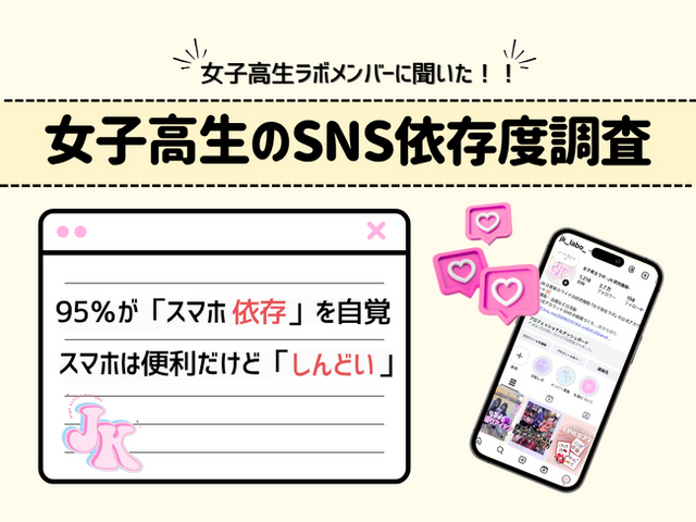 ティーン向けエンタテインメント事業を展開する株式会社with t(本社:東京都渋谷区、代表取締役社長:宮城啓太)が運営する「女子高生ラボ」は、最新トレンドに敏感な女子高生で構成された女子高生ラボメンバーに向けて、現役女子高生の「スマホ依存」に関する実態調査を実施しました。今回の調査から、全体の95%が自身を「スマホ依存」と認識していることが明らかになりました。スマホは現代の高校生にとって人間関係や学校生活にも深く関わる「生活インフラ」となっており、個人の意思だけでは距離を取ることが難しい構造的な課題が浮かび上がりました。