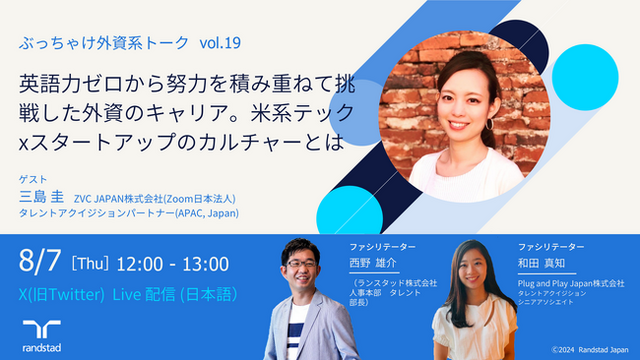 ランスタッド株式会社 人事本部タレント部長の西野雄介がファシリテーターを務める人気のシリーズで、19回目となる今回は、ZVC JAPAN株式会社(Zoom日本法人)でタレントアクイジションパートナーを務められる三島 圭さんをゲストにお迎えし、「英語ゼロから努力を積み重ねて挑戦した外資のキャリア。米系テック x スタートアップのカルチャーとは」をテーマにお話しいただきます。