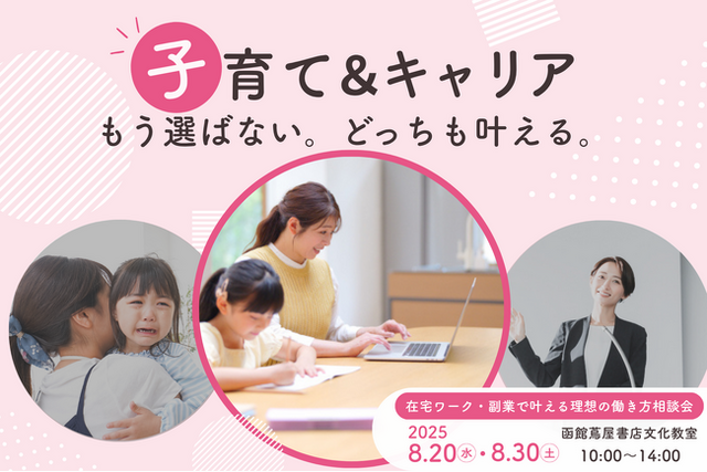 メイカラでは、子育て世帯の働き方の選択肢拡大を全国規模で推進するため、地方都市での対面イベント開催を開始します。第一弾として、2025年8月20日(水)・30日(土)(両日10:00~14:00)に函館蔦屋書店文化教室にて「【子育て世帯応援】在宅ワーク・副業で叶える理想の働き方相談会」を無料開催。参加費無料・手ぶら参加OK、子連れOKで、地方の子育て世帯にも気軽に新しい働き方の可能性を体験いただける機会を提供します。