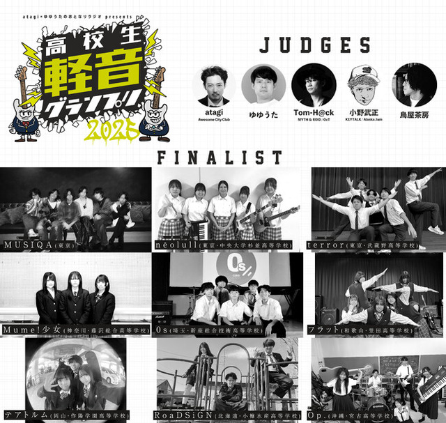 「高校生軽音グランプリ2025」とは、YouTubeの音楽ラジオ番組「atagi×ゆゆうたのおとなりラジオ」が主催となる高校生バンドの全国大会。2025年8月21日に横浜みなとみらいで開催される決勝戦では、動画審査で選ばれた高校生バンドがオリジナル曲を生放送で生演奏。プロのミュージシャンが審査し、高校生No1バンドを決定する。