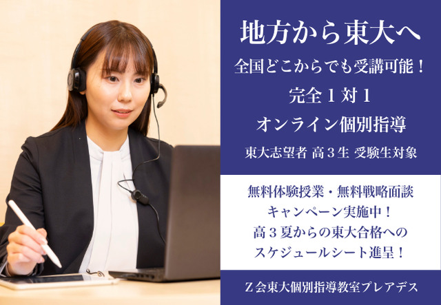 対象:日本国内にお住まいで東大志望の高3生・受験生で、Z会東大個別指導教室プレアデスの「 オンライン個別指導」において無料戦略面談・無料体験にご参加いただいた方