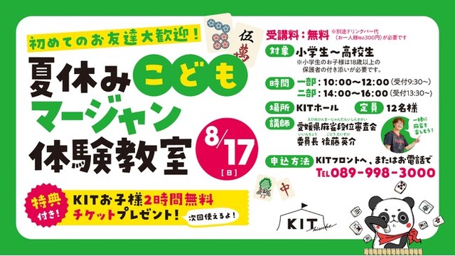 遊びが上手くなる遊び場「キスケKIT」および屋内型キッズパーク「KIT PLAY」を運営する総合エンターテイメント企業・キスケ株式会社(本社:愛媛県松山市、代表:山路義則)は、2025年8月17日(日)に、KIT内KIT Hallにて、「夏休みこどもマージャン体験教室」を開催し、参加者の募集を開始します。