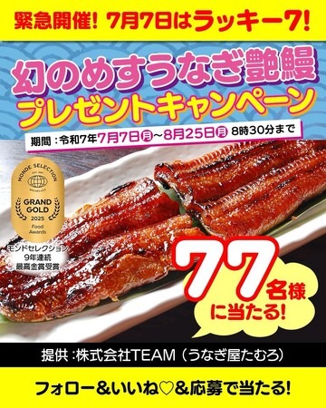 愛知県西尾市では、2025年7月7日(月)より、「緊急開催!7月7日はラッキー7!『幻のめすうなぎ艶鰻-えんまん-』77名様プレゼントキャンペーン」をスタートしました。