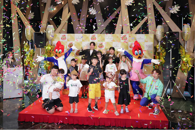 ユニバーサル・スタジオ・ジャパンの人気者『ウッディー&ウィニー・ウッドペッカー』もお祝いに駆けつけ、ロビーは瞬く間に華やかなムードに包まれました。