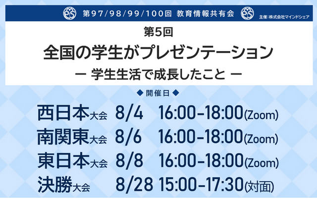 今回は、今年度で5度目の開催となる「学生プレゼン大会」のご案内です。本大会は西日本、南関東、東日本の3エリアに分け、オンラインにて実施し、各エリアから選ばれた7名が8月28日(木)に開催する決勝大会に進み、対面形式でプレゼンを行います。