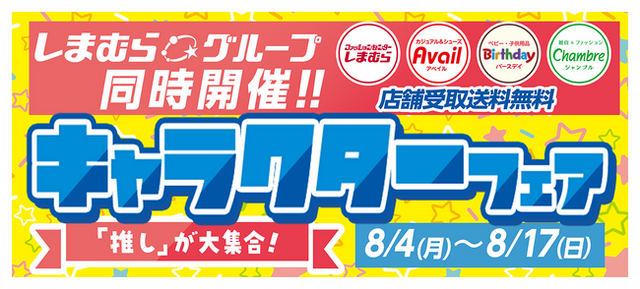 [画像1: https://prcdn.freetls.fastly.net/release_image/66095/285/66095-285-e71b22c88a2508609a8f798556e0680b-1080x488.png?width=536&quality=85%2C75&format=jpeg&auto=webp&fit=bounds&bg-color=fff ]8/4(月)~8/17(日)の期間中、しまむらグループ4事業(しまむら・アベイル・バースデイ・シャンブル)のオンラインストアにて、「キャラクターフェア」を同時開催します。人気のキャラクター商品を多数ご用意しておりますので、ぜひこの機会にお買い物をお楽しみください。