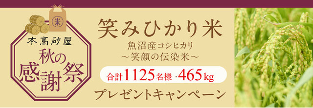 対象期間中、商品お買い求めまたはご応募により、収穫したての魚沼産コシヒカリ「笑みひかり米」を合計1,125名様・465kgプレゼントいたします。
