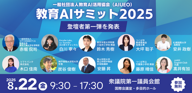 一般社団法人教育AI活用協会(所在地:東京都港区/代表理事:佐藤雄太)は、2025年8月22日(金)に、教育×AIをテーマとしたイベント「教育AIサミット2025 ~EDU HEROES あなたに託す教育の未来へのバトン~」を開催いたします。本サミットでは、教育現場でAIを活用している教育関係者、研究者、行政、企業など多様な“実践者”が一堂に会し、AIがもたらす教育改革の現在地と、これからの可能性について、多角的に議論・共有します。本日、イベントの出演者第1弾を発表いたしました。